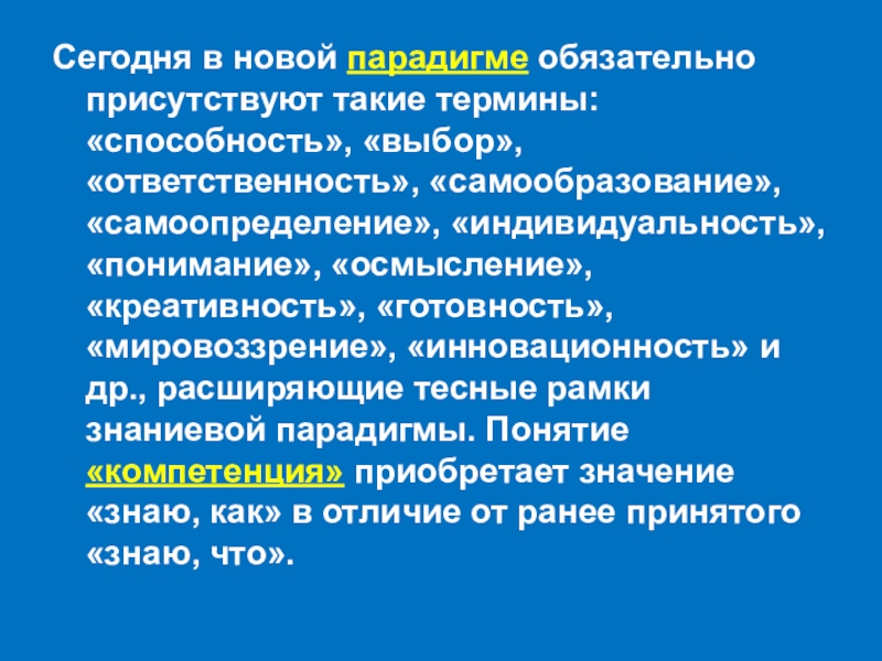 «самообразование», «самоопределение», «индивидуальность», «понимание», «осмысление», «креативность», «готовность», «мировоззрение», «инновационность» и др., расширяющие тесные рамки знаниевой парадигмы. Понятие «компетенция» приобретает значение «знаю, как» в отличие от ранее принятого «знаю, что».
