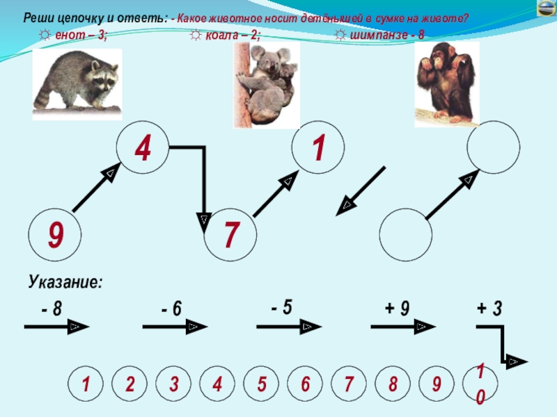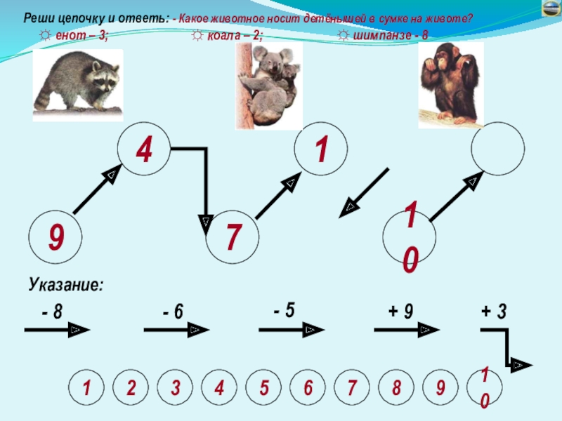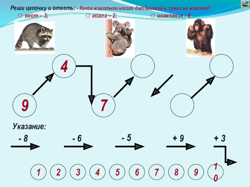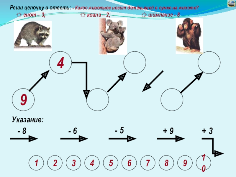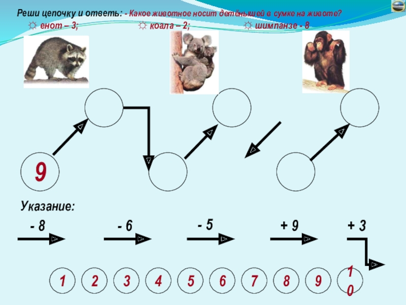 ☼ енот – 3; ☼ коала – 2; ☼ шимпанзе - 8