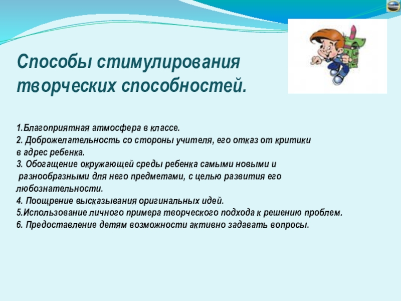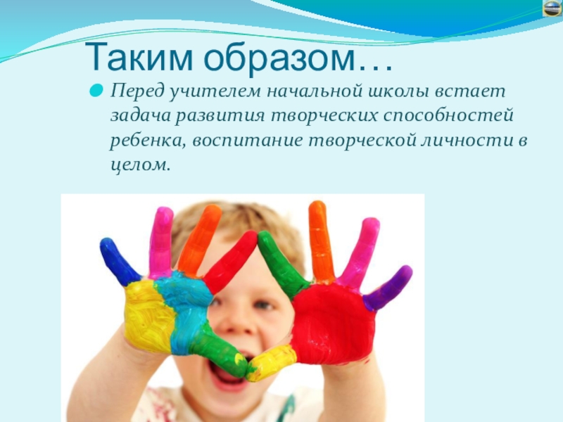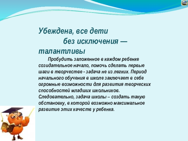 Пробудить заложенное в каждом ребенке созидательное начало, помочь сделать первые шаги в творчестве - задача не из легких. Период начального обучения в школе заключает в себе огромные возможности для развития творческих способностей младших школьников. Следовательно, задача школы – создать такую обстановку, в которой возможно максимальное развитие этих качеств у ребенка.