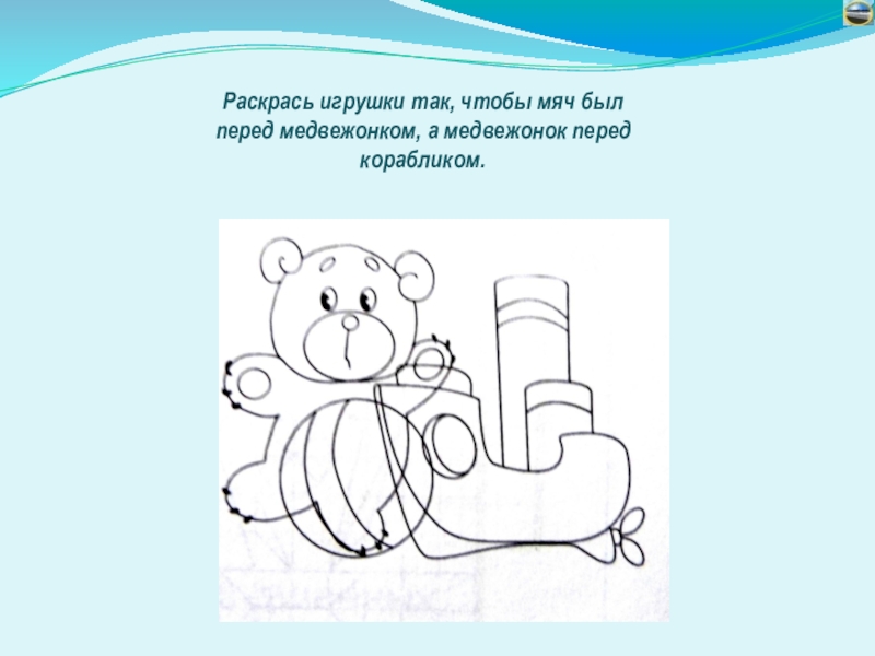 Слайд 14Раскрась игрушки так, чтобы мяч был перед медвежонком, а медвежонок перед