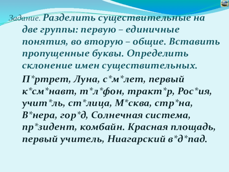 Слайд 41Задание. Разделить существительные на две группы: первую – единичные понятия, во