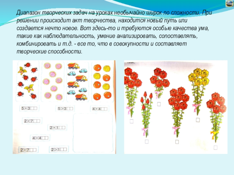 Слайд 11Диапазон творческих задач на уроках необычайно широк по сложности. При решении