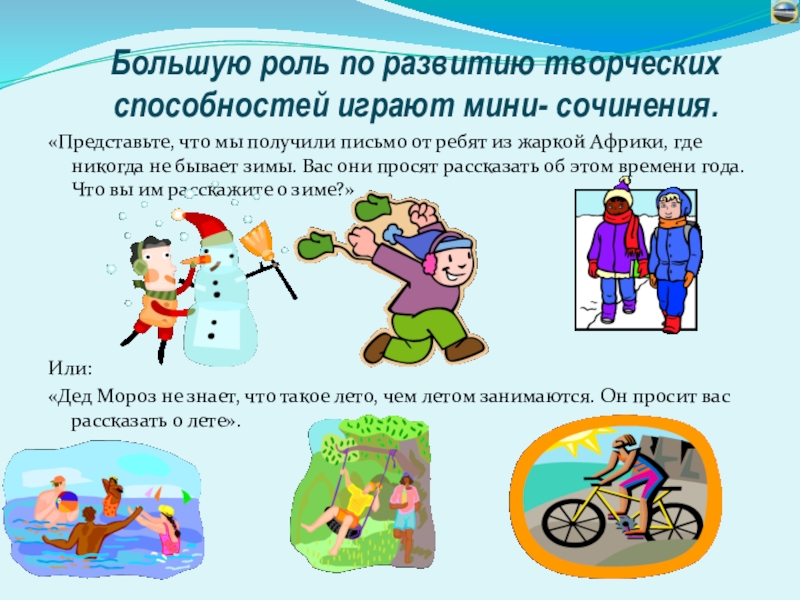 Слайд 45Большую роль по развитию творческих способностей играют мини- сочинения.