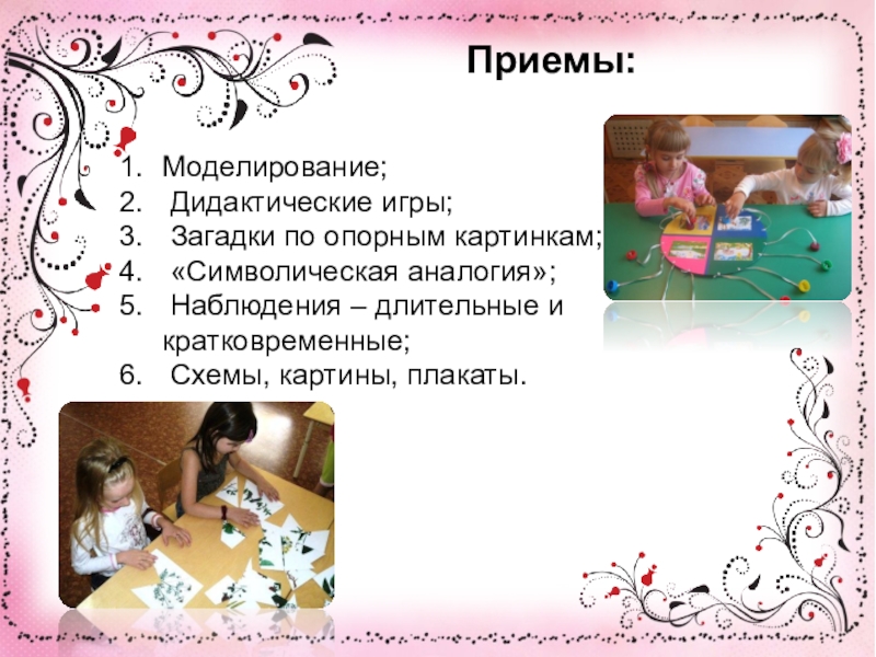 Приемы:Моделирование; Дидактические игры; Загадки по опорным картинкам; «Символическая аналогия»; Наблюдения – длительные и кратковременные; Схемы, картины, плакаты.