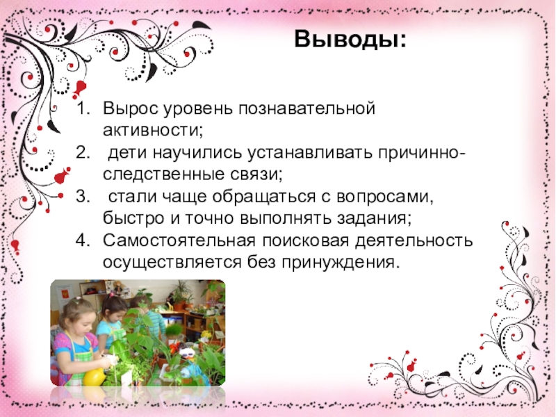 Выводы:Вырос уровень познавательной активности; дети научились устанавливать причинно-следственные связи; стали чаще обращаться с вопросами, быстро и точно