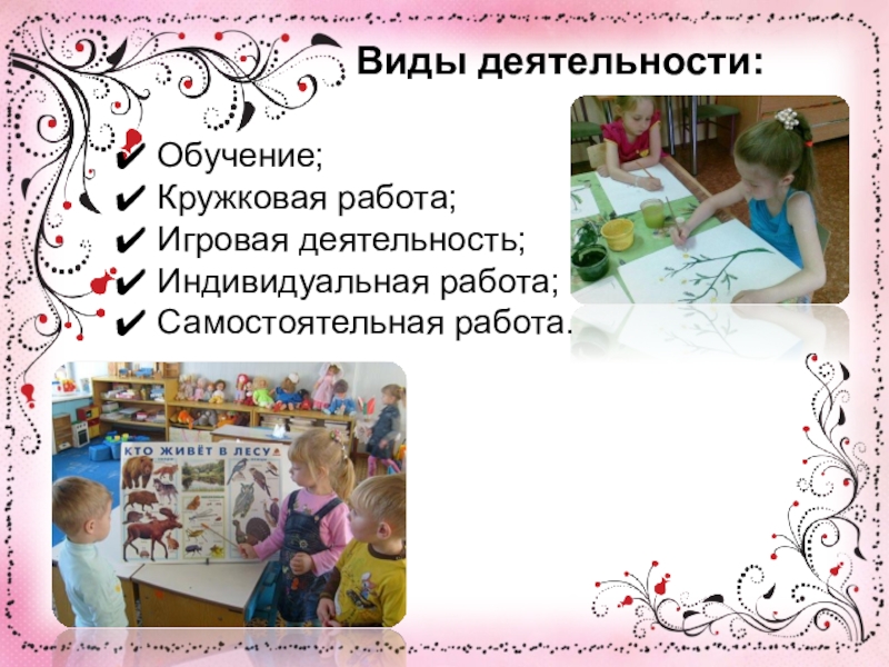 Виды деятельности:Обучение;Кружковая работа;Игровая деятельность;Индивидуальная работа;Самостоятельная работа.
