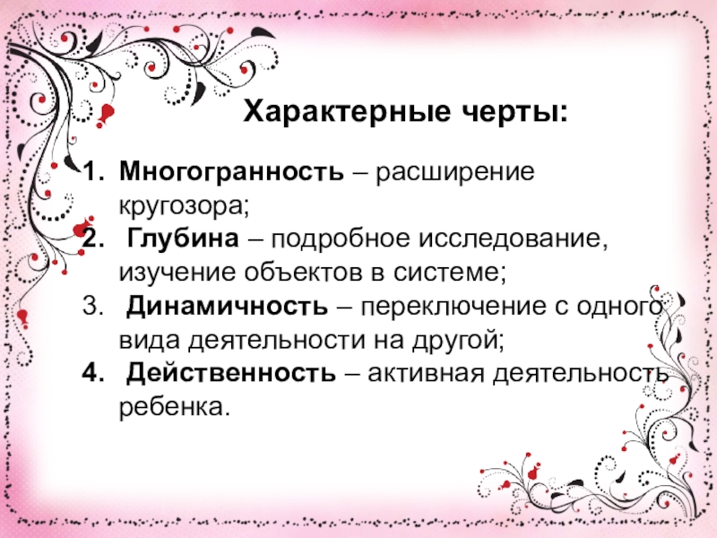 Характерные черты:Многогранность – расширение кругозора; Глубина – подробное исследование, изучение объектов в системе; Динамичность – переключение с