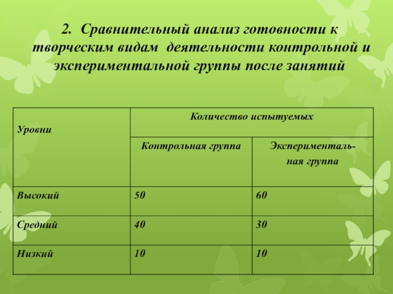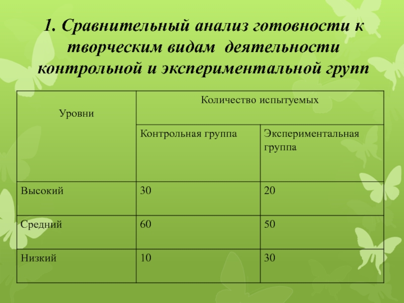 Слайд 81. Сравнительный анализ готовности к творческим видам деятельности контрольной и экспериментальной