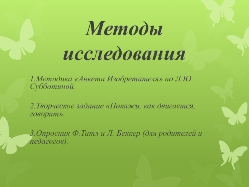 Методы исследования1.Методика «Анкета Изобретателя» по Л.Ю. Субботиной. 2.Творческое задание «Покажи, как двигается, говорит». 3.Опросник Ф.Татл и Л.