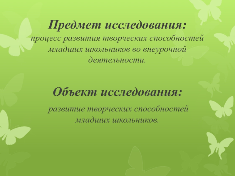 Слайд 5Предмет исследования: процесс развития творческих способностей младших школьников во внеурочной деятельности.