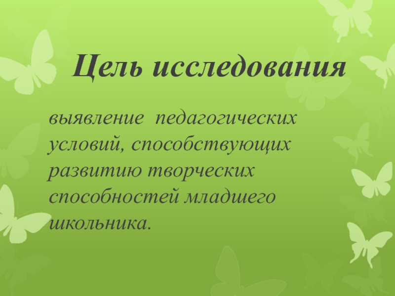Цель исследованиявыявление педагогических условий, способствующих развитию творческих способностей младшего школьника.