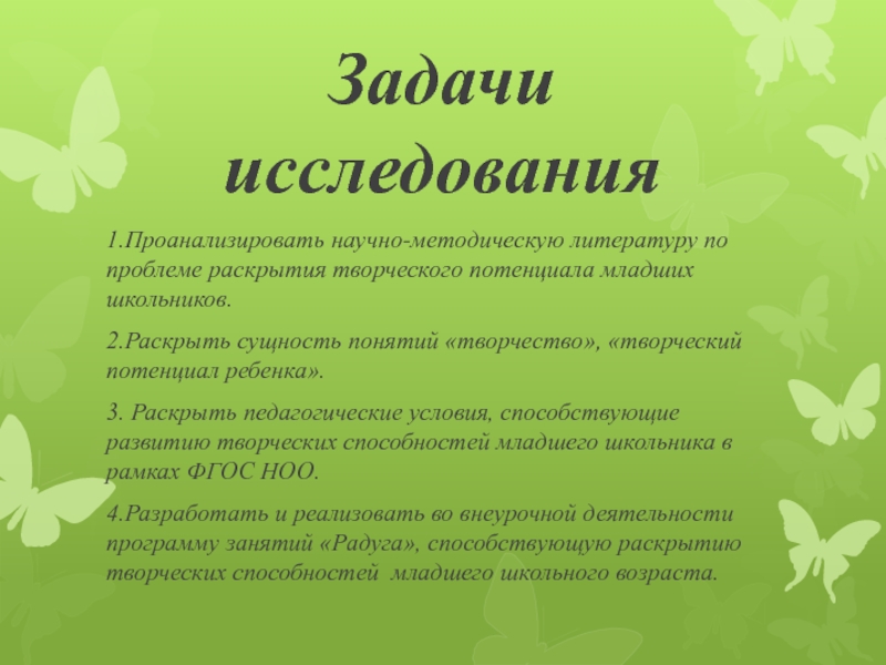 Задачи исследования1.Проанализировать научно-методическую литературу по проблеме раскрытия творческого потенциала младших школьников.2.Раскрыть сущность понятий «творчество», «творческий потенциал ребенка».3.