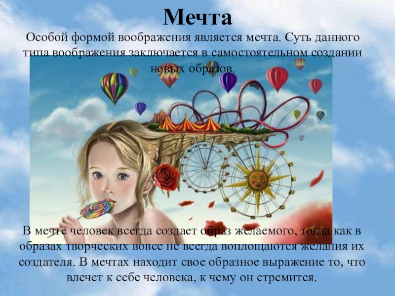 В мечте человек всегда создает образ желаемого, тогда как в образах творческих вовсе не всегда воплощаются желания их создателя. В мечтах находит свое образное выражение то, что влечет к себе человека, к чему он стремится.