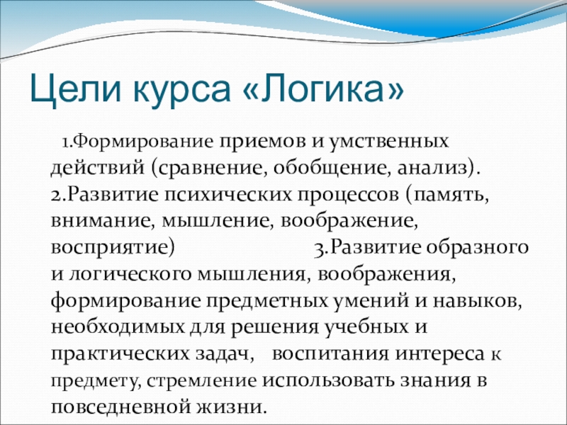 2.Развитие психических процессов (память, внимание, мышление, воображение, восприятие) 3.Развитие образного и логического мышления, воображения, формирование предметных умений и навыков, необходимых для решения учебных и практических задач, воспитания интереса к предмету, стремление использовать знания в повседневной жизни.
