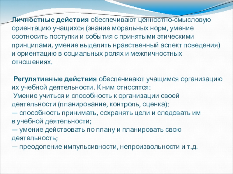 Слайд 5Личностные действия обеспечивают ценностно-смысловую ориентацию учащихся (знание моральных норм, умение соотносить