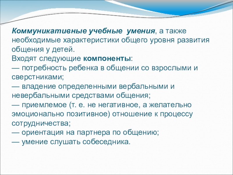 Слайд 7Коммуникативные учебные умения, а также необходимые характеристики общего уровня развития общения