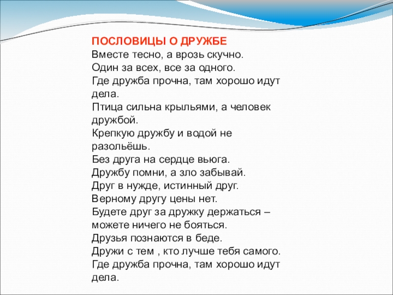 Слайд 26ПОСЛОВИЦЫ О ДРУЖБЕ