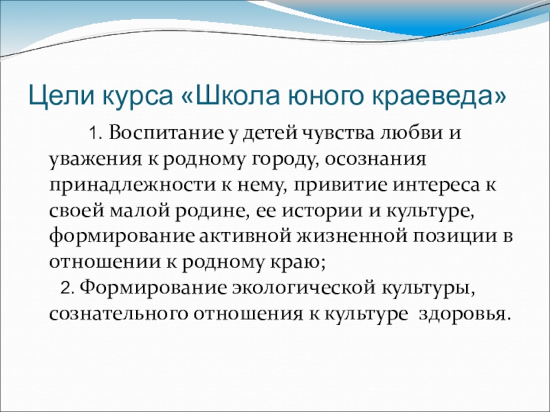 уважения к родному городу, осознания принадлежности к нему, привитие интереса к своей малой родине, ее истории и культуре, формирование активной жизненной позиции в отношении к родному краю;