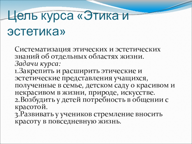 1.Закрепить и расширить этические и эстетические представления учащихся, полученные в семье, детском саду о красивом и некрасивом в жизни, природе, искусстве.