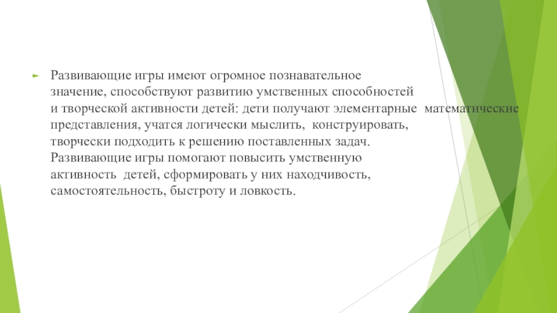 Слайд 3Развивающие игры имеют огромное познавательное значение, способствуют развитию умственных способностей и