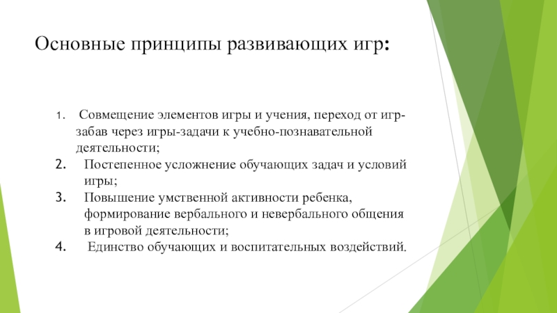 Основные принципы развивающих игр: Совмещение элементов игры и учения, переход от игр-забав через игры-задачи к учебно-познавательной деятельности; Постепенное