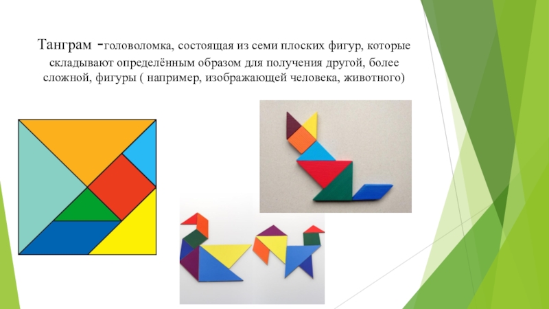 Танграм -головоломка, состоящая из семи плоских фигур, которые складывают определённым образом для получения другой, более сложной, фигуры