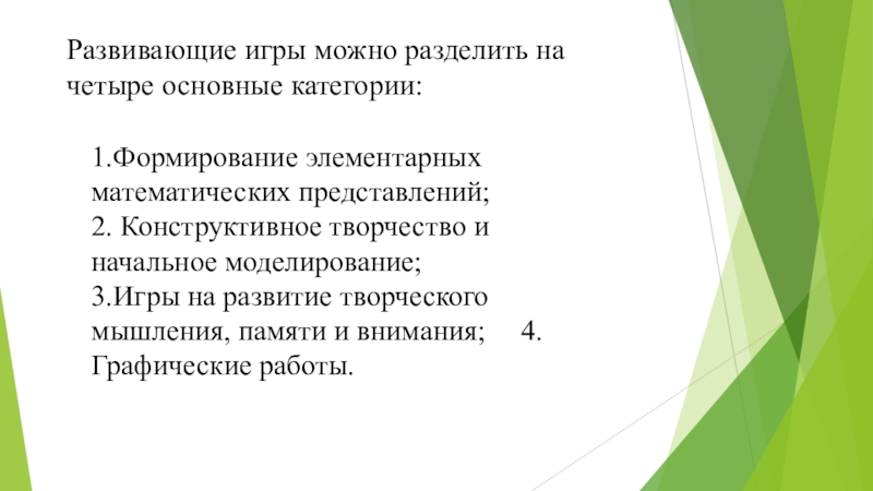 Слайд 4Развивающие игры можно разделить на четыре основные категории: