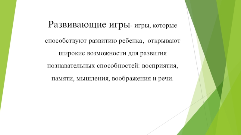 Развивающие игры- игры, которые способствуют развитию ребенка,  открывают широкие возможности для развития познавательных способностей: восприятия, памяти, мышления, воображения и речи.
