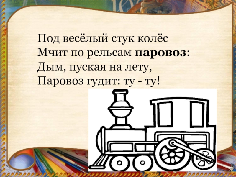 Слайд 5Под весёлый стук колёс Мчит по рельсам паровоз: Дым, пуская на лету, Паровоз гудит: ту