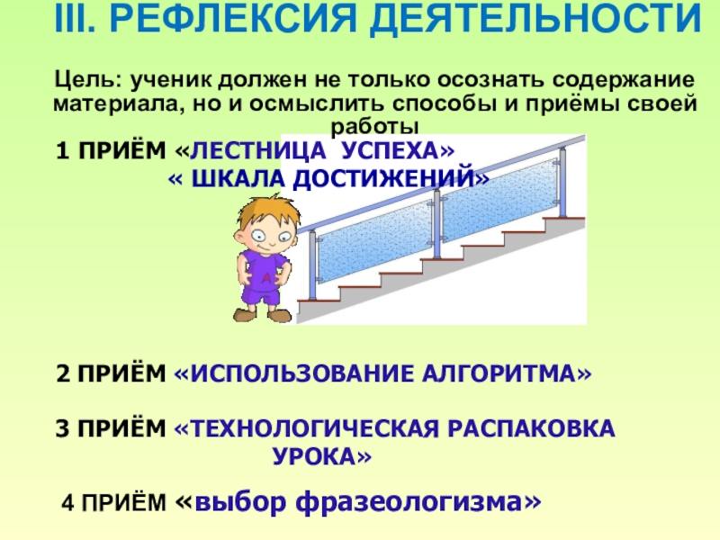 Цель: ученик должен не только осознать содержание материала, но и осмыслить способы и приёмы своей работы