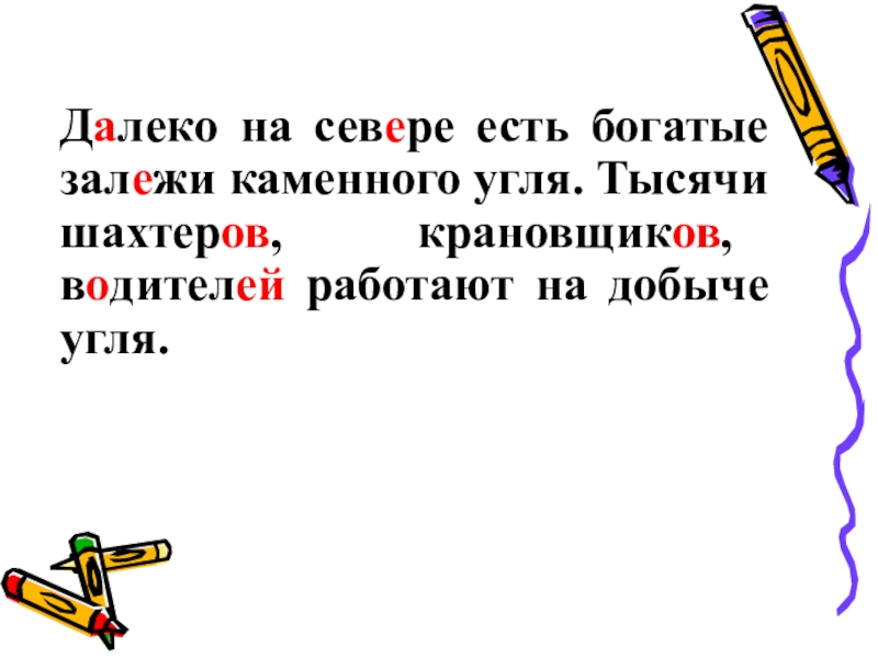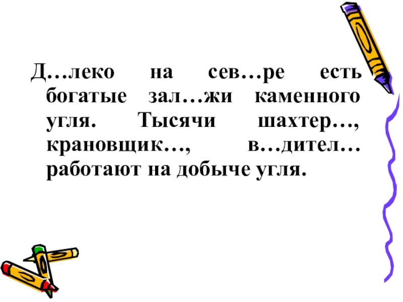 Слайд 14Д…леко на сев…ре есть богатые зал…жи каменного угля. Тысячи шахтер…, крановщик…,