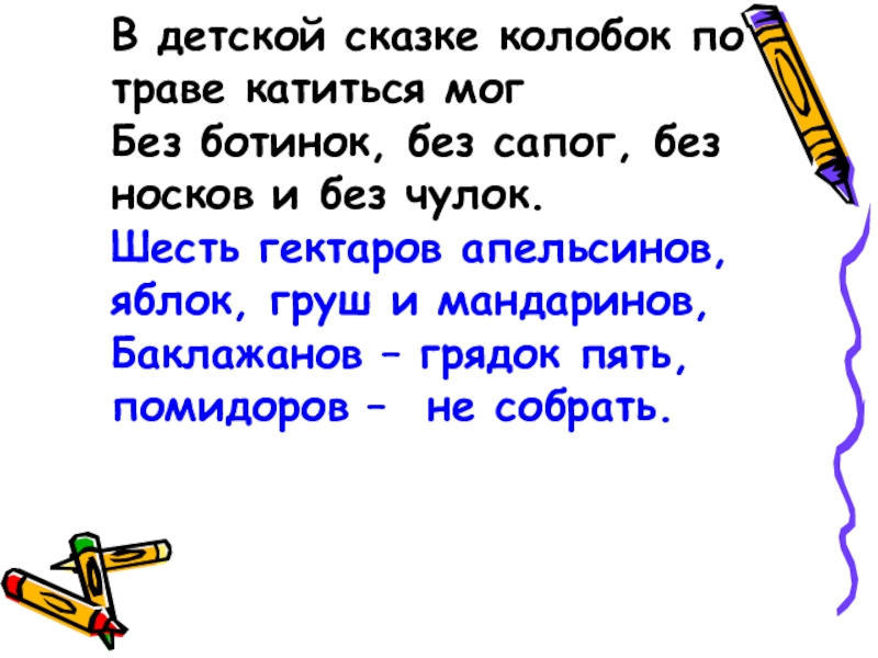 В детской сказке колобок по траве катиться могБез ботинок, без сапог, без носков и без чулок.Шесть гектаров