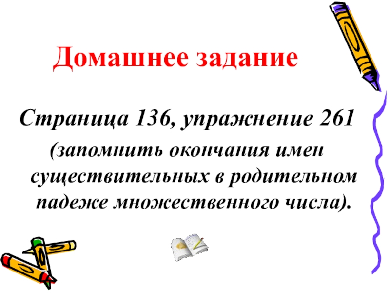 Домашнее заданиеСтраница 136, упражнение 261 (запомнить окончания имен существительных в родительном падеже множественного числа).