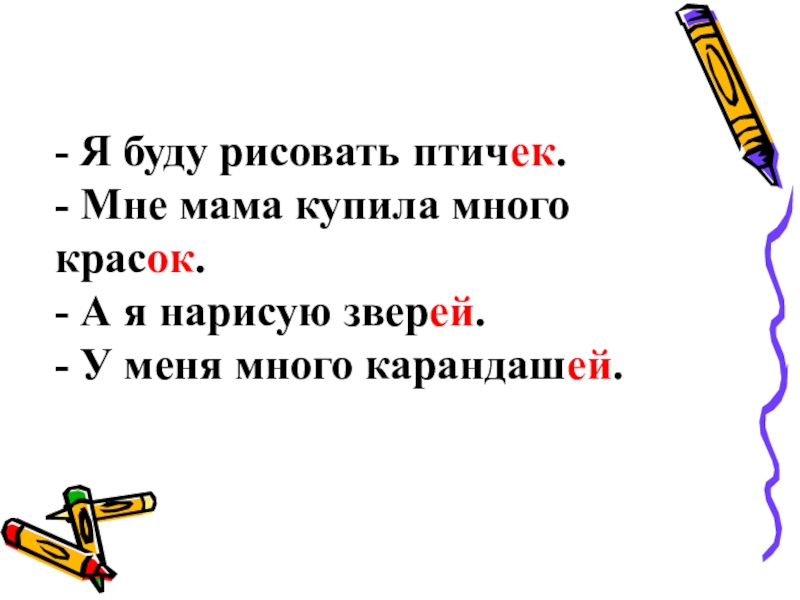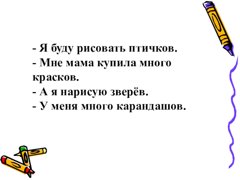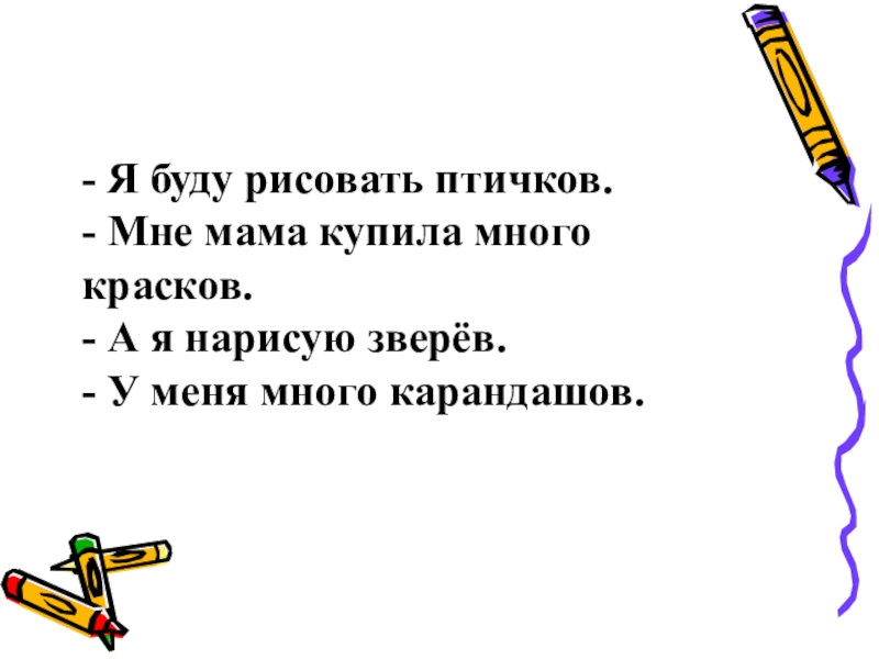 - Я буду рисовать птичков.- Мне мама купила много красков.- А я нарисую зверёв.- У меня много карандашов.