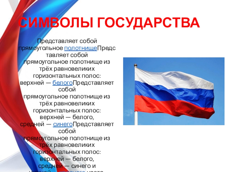 Представляет собой прямоугольное полотнищеПредставляет собой прямоугольное полотнище из трёх равновеликих горизонтальных полос: верхней — белогоПредставляет