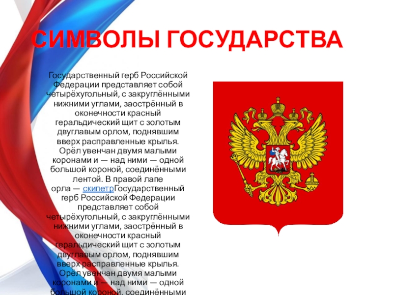 углами, заострённый в оконечности красный геральдический щит с золотым двуглавым орлом, поднявшим вверх расправленные крылья. Орёл увенчан двумя малыми коронами и — над ними — одной большой короной, соединёнными лентой. В правой лапе орла — скипетрГосударственный герб Российской Федерации представляет собой четырёхугольный, с закруглёнными нижними углами, заострённый в оконечности красный геральдический щит с золотым двуглавым орлом, поднявшим вверх расправленные крылья. Орёл увенчан двумя малыми коронами и — над ними — одной большой короной, соединёнными лентой. В правой лапе орла — скипетр, в левой — держава. На груди орла, в красном щите, — серебряный всадник в синем плаще на серебряном коне, поражающий серебряным копьём чёрного, опрокинутого навзничь и попранного конём дракона.