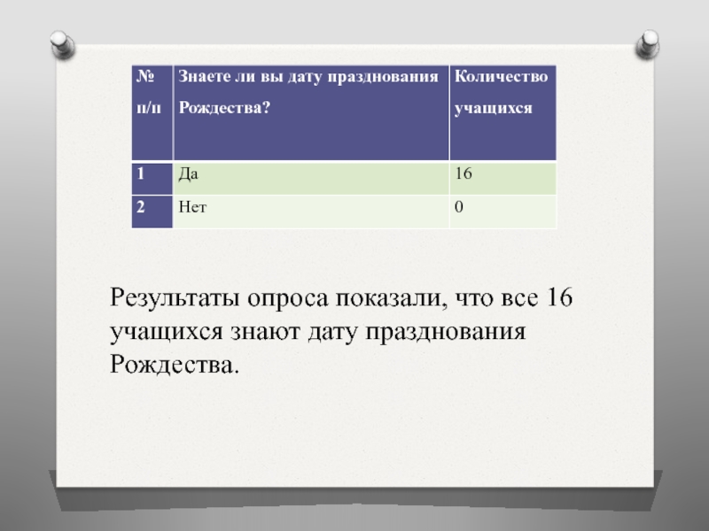 Слайд 37Результаты опроса показали, что все 16 учащихся знают дату празднования Рождества.