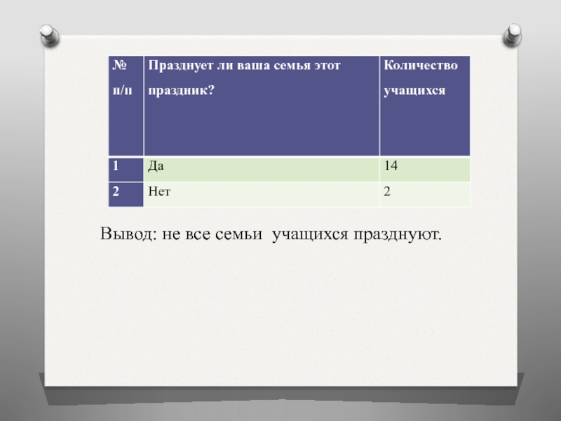 Слайд 38Вывод: не все семьи учащихся празднуют.