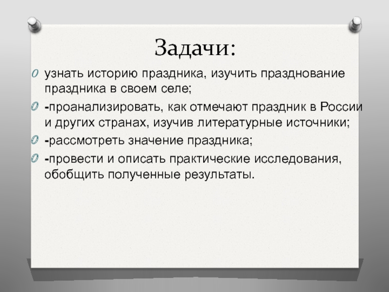 Задачи:узнать историю праздника, изучить празднование праздника в своем селе;-проанализировать, как отмечают праздник в России и других странах,