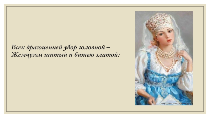 Слайд 8Всех драгоценней убор головной – Жемчугом шитый и битью златой: