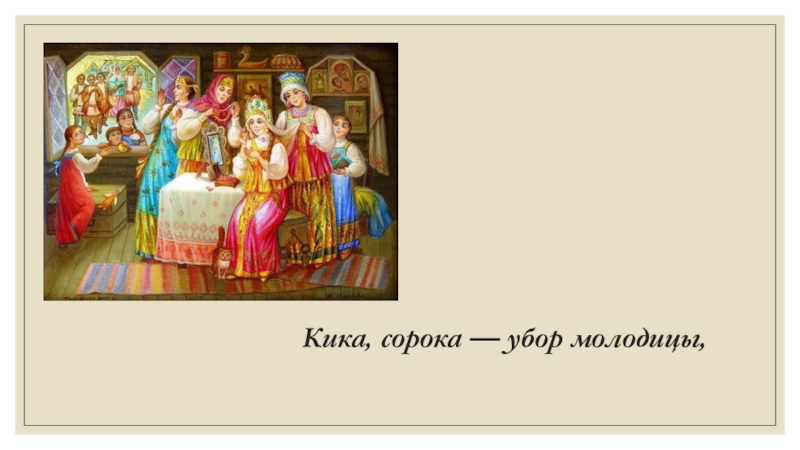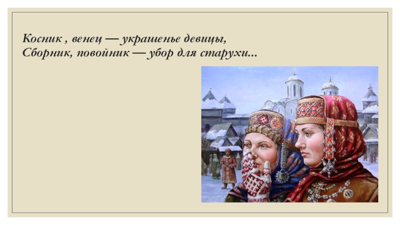 Слайд 10Косник , венец — украшенье девицы, Сборник, повойник — убор для старухи...