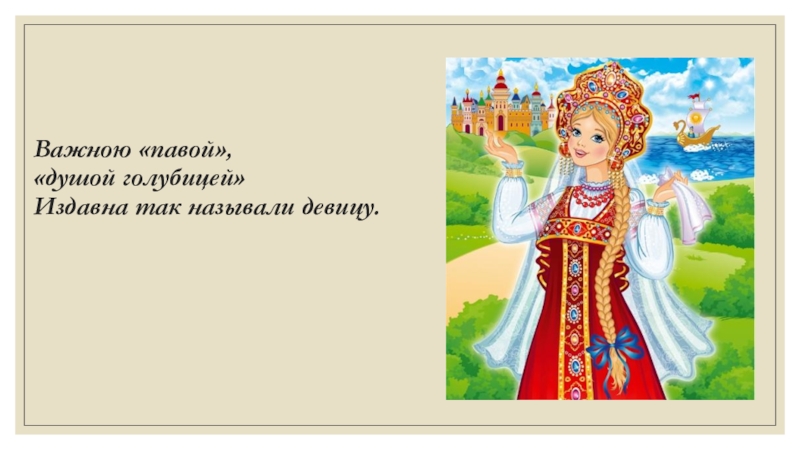 Слайд 2Важною «павой», «душой голубицей» Издавна так называли девицу.