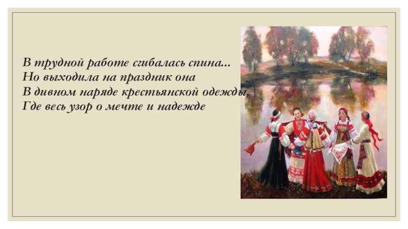 Слайд 4В трудной работе сгибалась спина... Но выходила на праздник она В дивном наряде