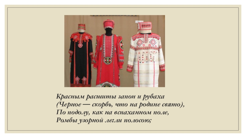 Слайд 5Красным расшиты запон и рубаха (Черное — скорбь, что на родине свято), По