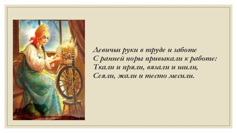 Слайд 3Девичьи руки в труде и заботе С ранней поры привыкали к работе: Ткали