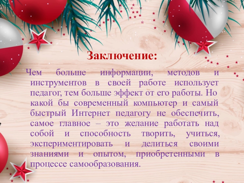 использует педагог, тем больше эффект от его работы. Но какой бы современный компьютер и самый быстрый Интернет педагогу не обеспечить, самое главное – это желание работать над собой и способность творить, учиться, экспериментировать и делиться своими знаниями и опытом, приобретенными в процессе самообразования.