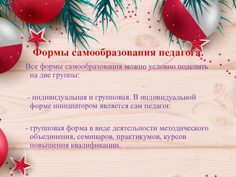 - индивидуальная и групповая. В индивидуальной форме инициатором является сам педагог.