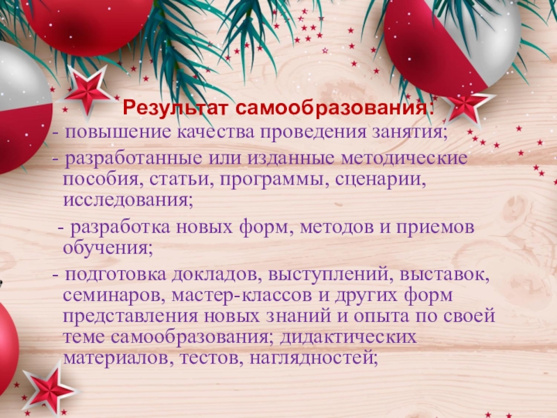 - подготовка докладов, выступлений, выставок, семинаров, мастер-классов и других форм представления новых знаний и опыта по своей теме самообразования; дидактических материалов, тестов, наглядностей;