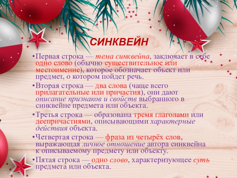 Первая строка — тема синквейна, заключает в себе одно слово (обычно существительное