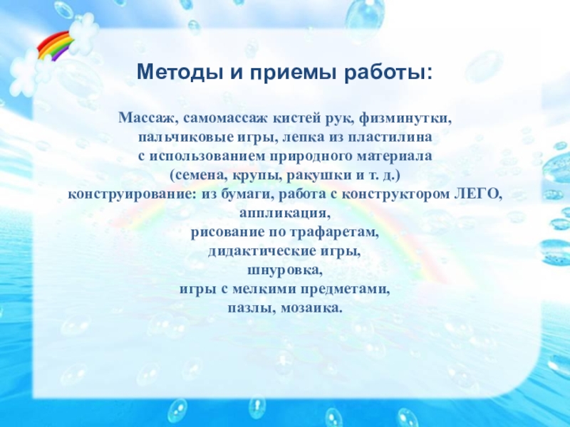 - Развивать мелкую моторику пальцев рук у детей дошкольного возраста через использование разнообразных форм, методов и приемов.